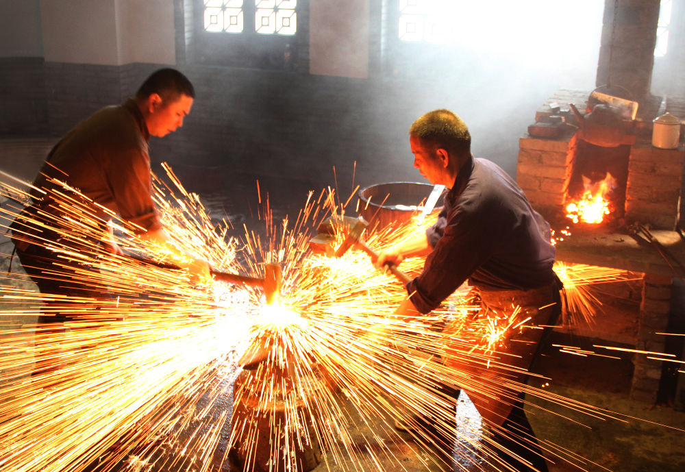 国度级非遗代表性传承东说念主、沈广隆剑铺第四代传东说念主沈新培(右)与第五代传东说念主沈州铸造宝剑。(受访者供图)