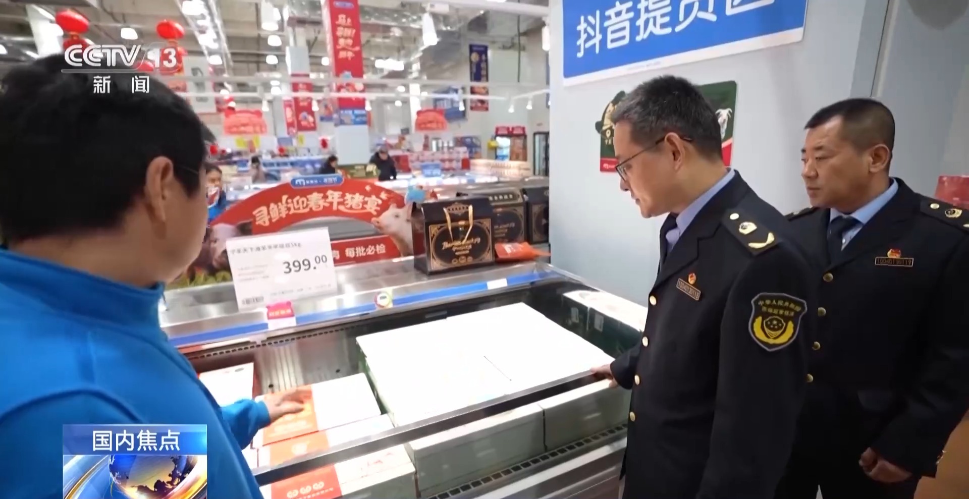 在常州天宁区一家大型购物中心,国法东谈主员率先对春节热销的畜禽肉类礼盒进行现场核查。