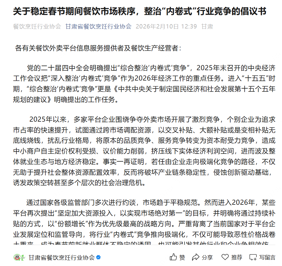 甘肃省餐饮烹调行业协会在春节前发布外卖竞争倡议书。