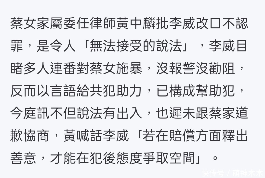 其二,受害者家属暗意李威夫妻从前年11月起就透过讼师抒发息争主张,还与受害者家属约在讼师事务所碰头,就地送了生果礼盒。之后,又真正陈诉结案情经过,让家属能掌捏蔡姓女子过世的原因,最终家属磋议到李威夫妻仍是作念出合理抵偿,便恳求法院从轻量刑。