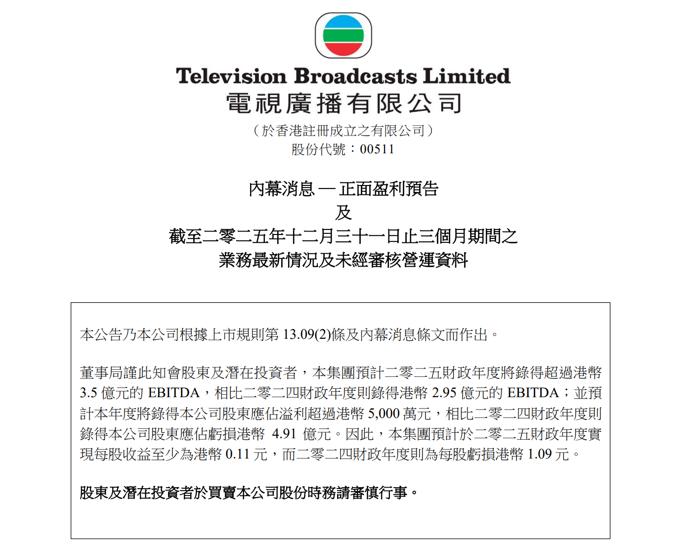 近日,电视播送有限公司(简称:电视播送;英文简称:TVB;000511.HK)发布功绩盈利预报,预测2025财年盈利向上5000万港元,同比扭亏为盈,2024年财年公司亏空4.91亿港元。公司预测2025财年EBITDA(息税折旧及摊销前利润)超3.5亿港元,2024财年为2.95亿港元;已毕每股收益至少0.11港元,2024年财年每股亏空1.09港元。