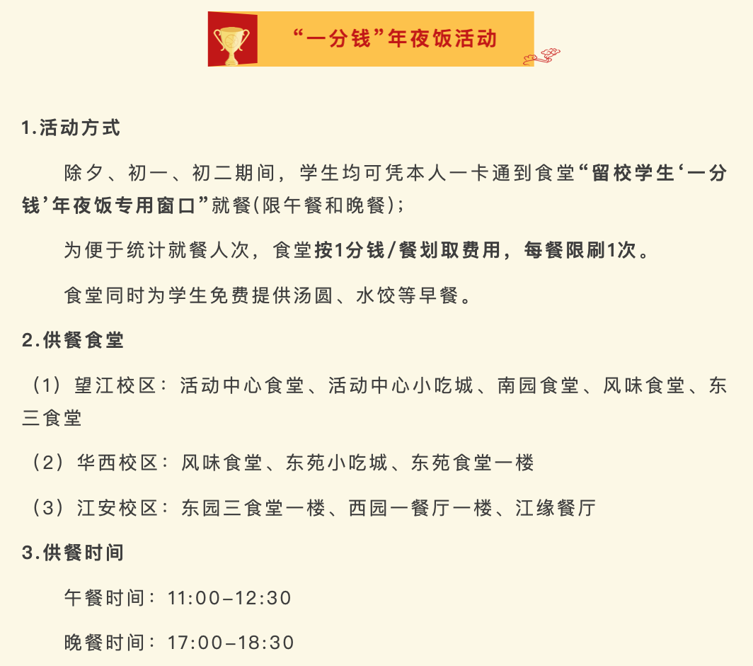 可免费到食堂享用除夕饭