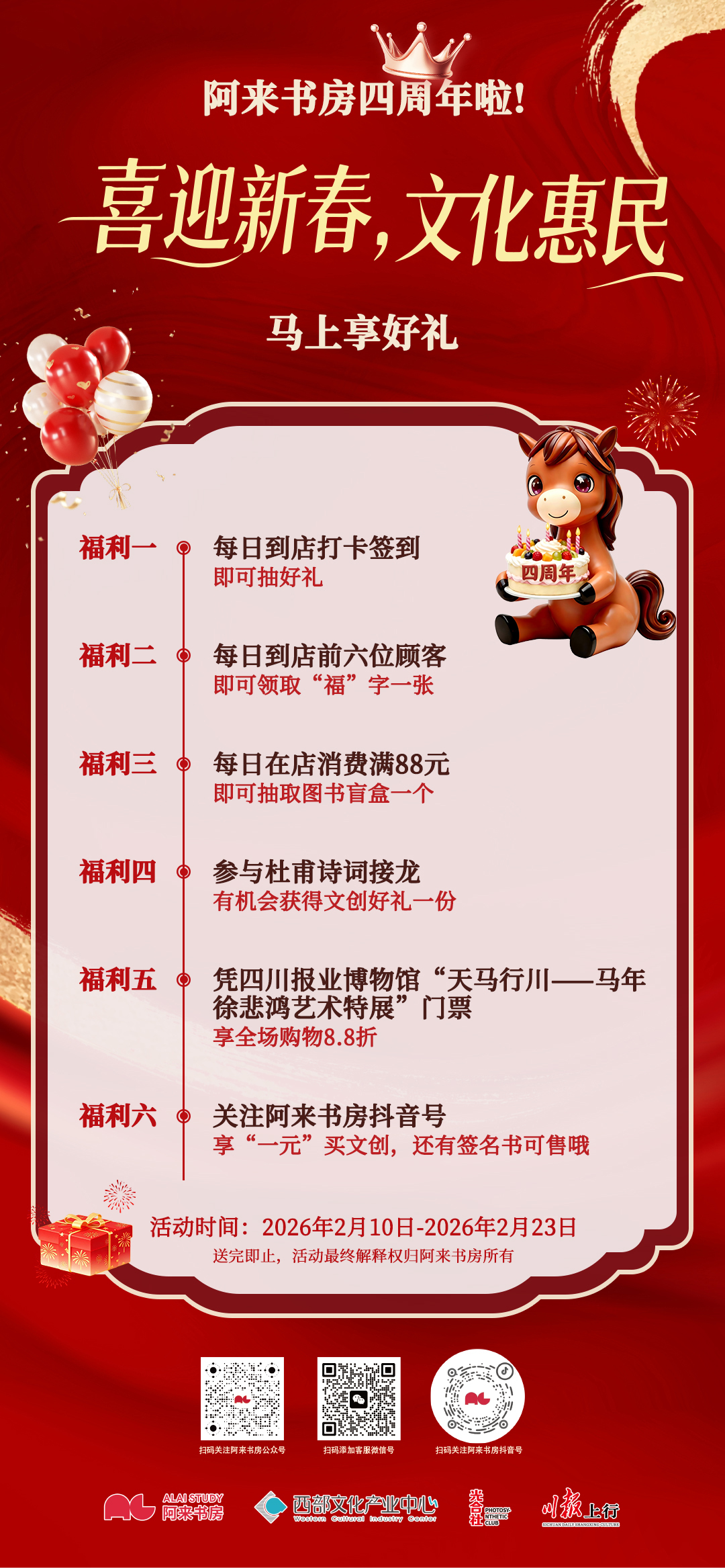 马年的脚步越来越近,春节假期近在目下,你是不是也很期待?迎来四周年的阿来书斋,从2月10日起到2月23日,推出六再行春福利:到店打卡签到抽好礼、逐日到店前六名主顾送“福”字一张、破钞满88元抽史籍盲盒、接龙送文创邻近、凭徐悲鸿艺术特展门票享全场8.8折,阿来书斋抖店一元买文创。这个春节假期,快来阿来书斋共度一段与书相伴的奥秘时光。